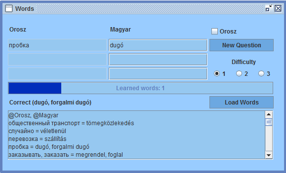 Miután a szavaid a szövegmezőben vannak nyomd meg a "Szavak betöltése/Load Words" gombot. A program beolvassa a szavaidat és már indul is a gyakorlás, várja az első megjelenített szóra a másik nyelven megadott jelentést. Miután begépelted a választ, nyomd meg a billentyűzeted "Enter" gombját vagy a képernyőn lévő "Ellenőrzés/Check" gombot. Válaszod értékelése megjelenik az üzenetsorban: "Correct/helyes válasz" vagy "Incorrect/helytelen" és mögötte a helyes válasz. Amint a szavak betöltődnek a megadott szószedet eltűnik, a program felgörgeti a szövegmezőben, hogy ne zavarjon a gyakorlás során. A kérdések véletlenszerűen jönnek. Gyakorlás során is bármikor úgy dönthetsz, hogy a másik nyelven beírt jelentést szeretnéd látni, ezt úgy érheted el, hogy átállítod a jobb felső sarokban lévő jelölőnényzetet. Amennyiben több mint egy jelentést adtál meg, lehetőség van arra, hogy a megadott választ csak akkor fogadja el a program, ha minden jelentést helyesen beírtál. Ehhez a nehézséget kell állítanod a "Difficulty" gombokkal. Ha 1 van beállítva akkor elfogad 1 helyes jelentést is, ha 3 akkor az összes megadott jelentést tudnod kell. Maximum 3-at lehet megadni. A választ a szövegmezők bármelyikébe begépelheted, nem kell tartani a beírt sorrendet. Miután minden kérdésre sikeresen válaszoltál az "Új játék/New Game" gomb segítségével újrakezdheted ugyanezen szavak gyakorlását. A begépelt/bemásolt tartalomra vonatkozó szabályok: